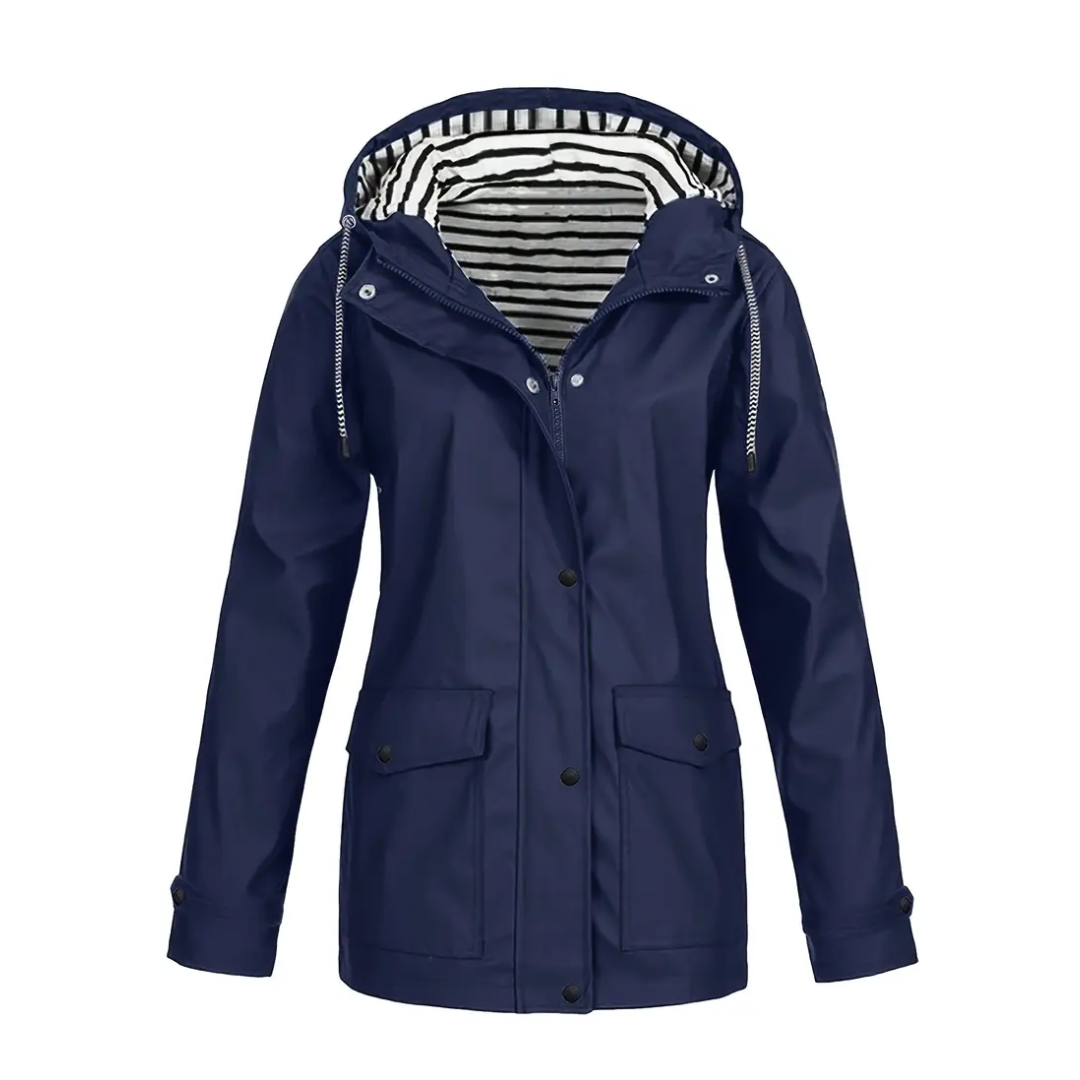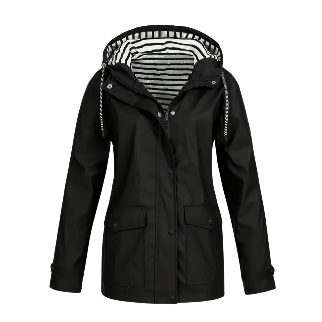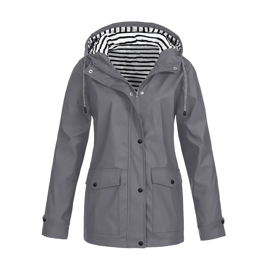 Ga droog en stijlvol de deur uit met deze rits-hoodie windbreaker. De jas combineert een soepel vallende, waterafstotende polyestershell met een gestreepte voering in de capuchon en praktische klepzakken, perfect voor frisse herfstdagen en winderige winterwandelingen.