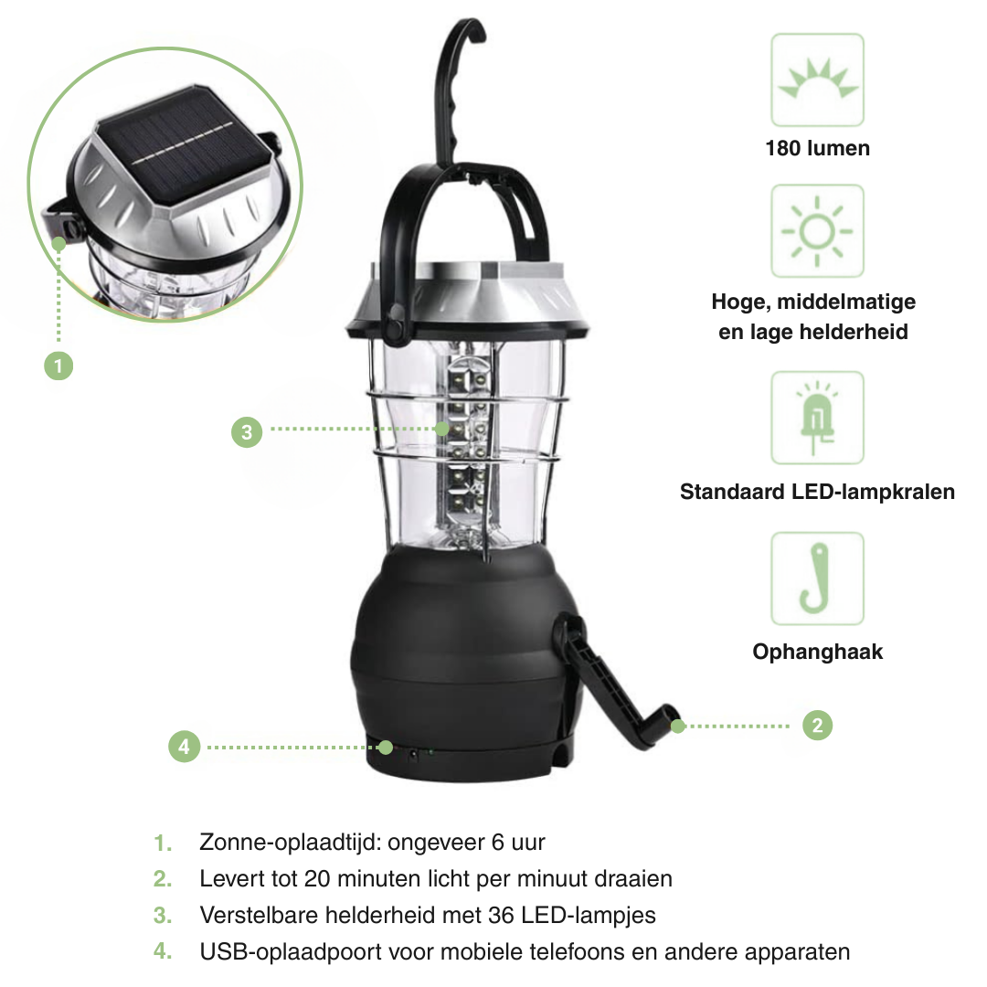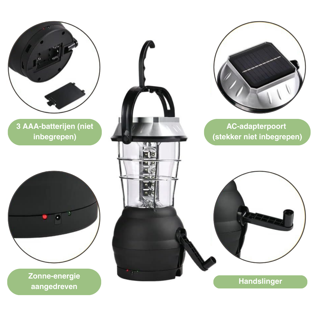 Ga nooit zonder licht op pad met deze veelzijdige camping lantaarn. Dankzij de combinatie van zonnepaneel, hand crank dynamo, USB, auto-adapter en AAA-batterijen beschik je altijd over betrouwbare verlichting – ideaal voor kamperen, wandelen of noodsituaties thuis.
