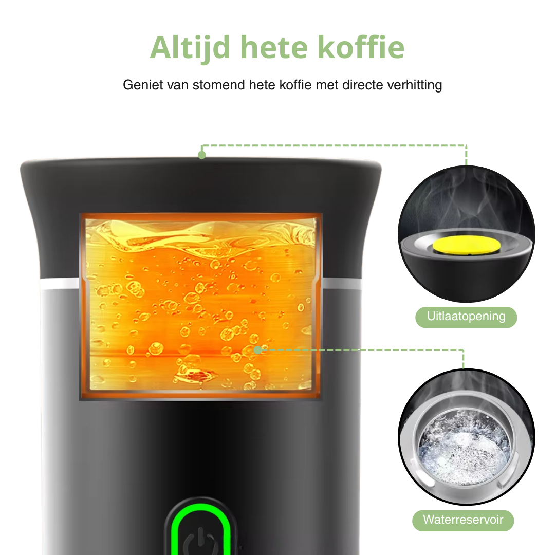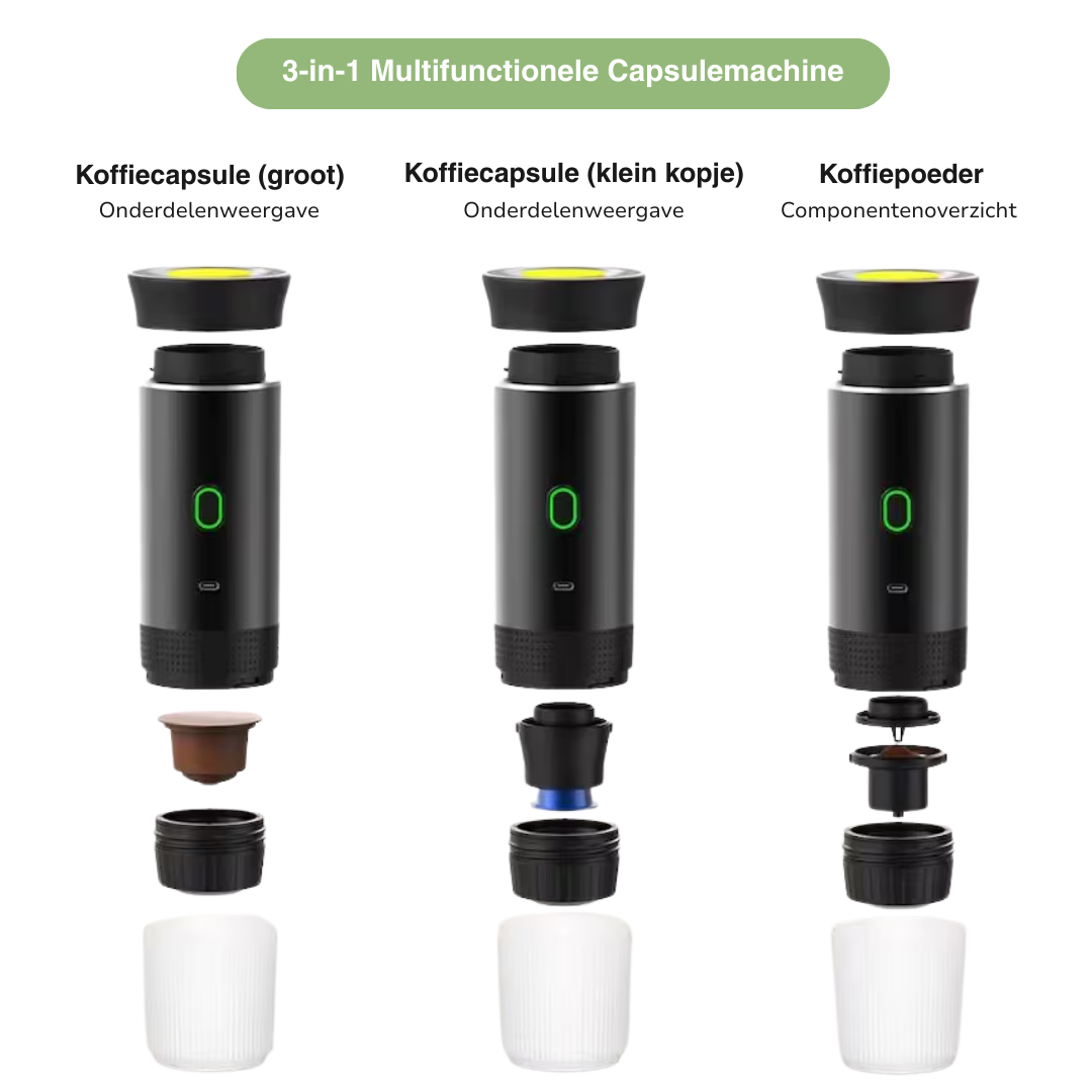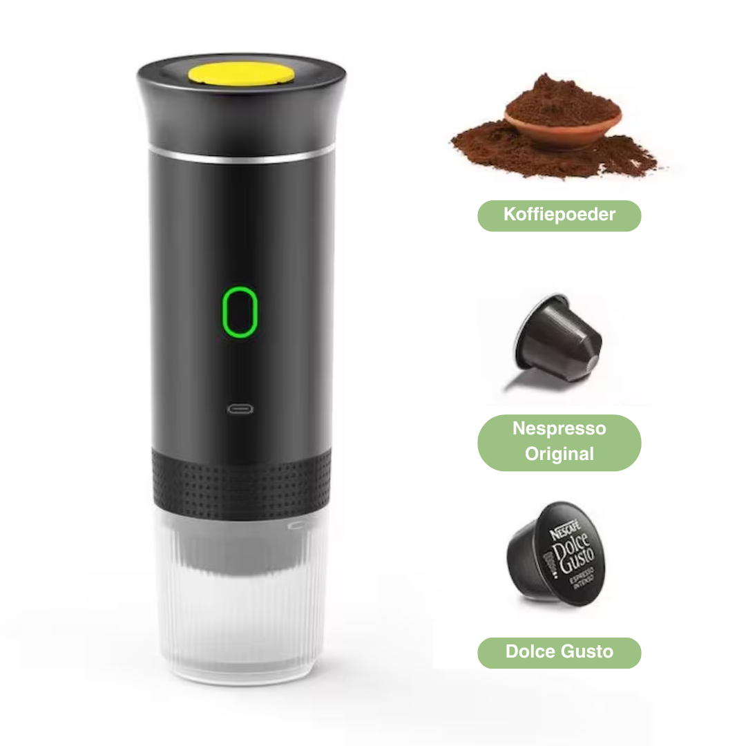 Altijd en overal een verse espresso. Deze compacte, USB-oplaadbare koffiemachine past in je tas en werkt met koffiecapsules én gemalen koffie. Ideaal voor kantoor, onderweg of op reis: binnen enkele minuten geniet je van je favoriete koffie met een volle crema.