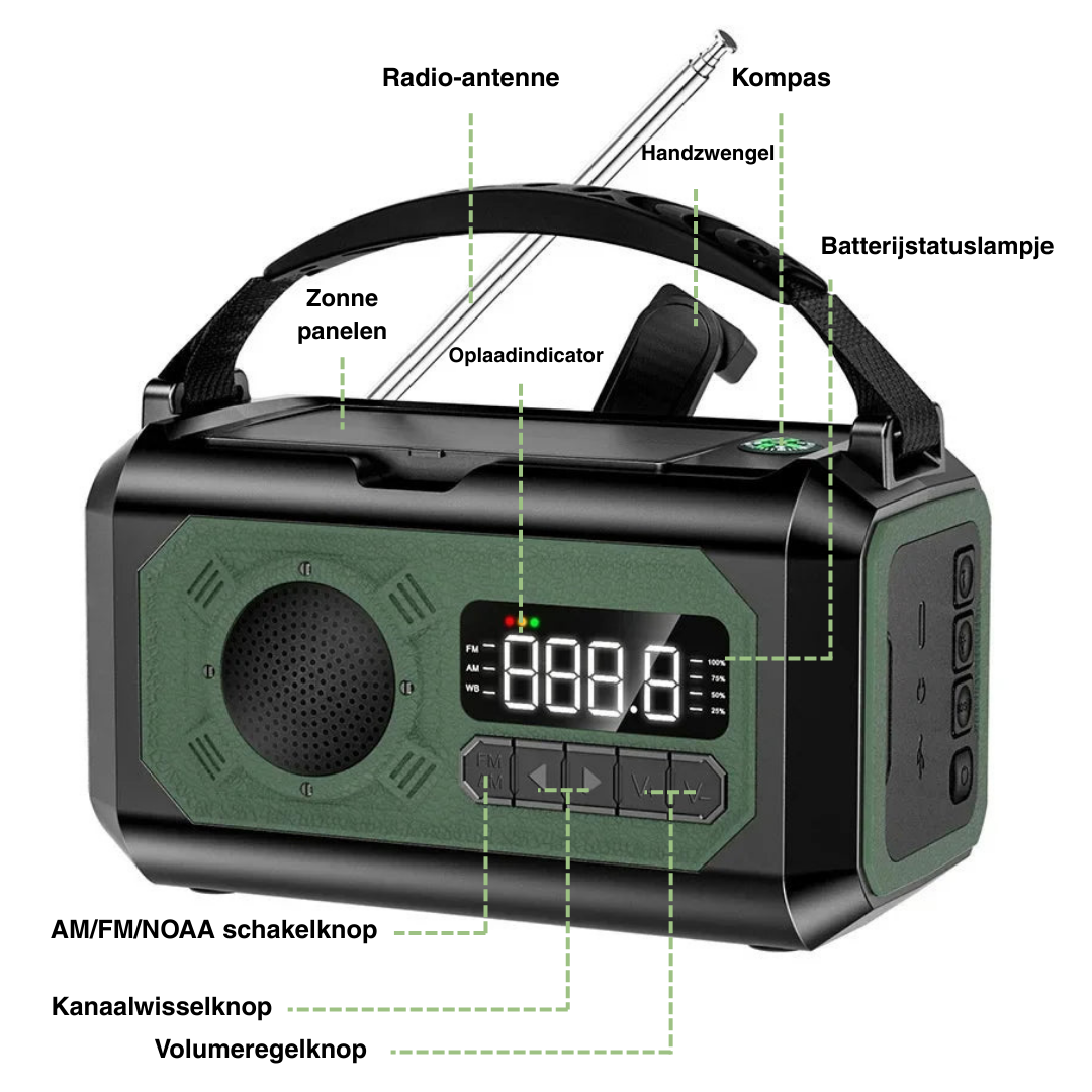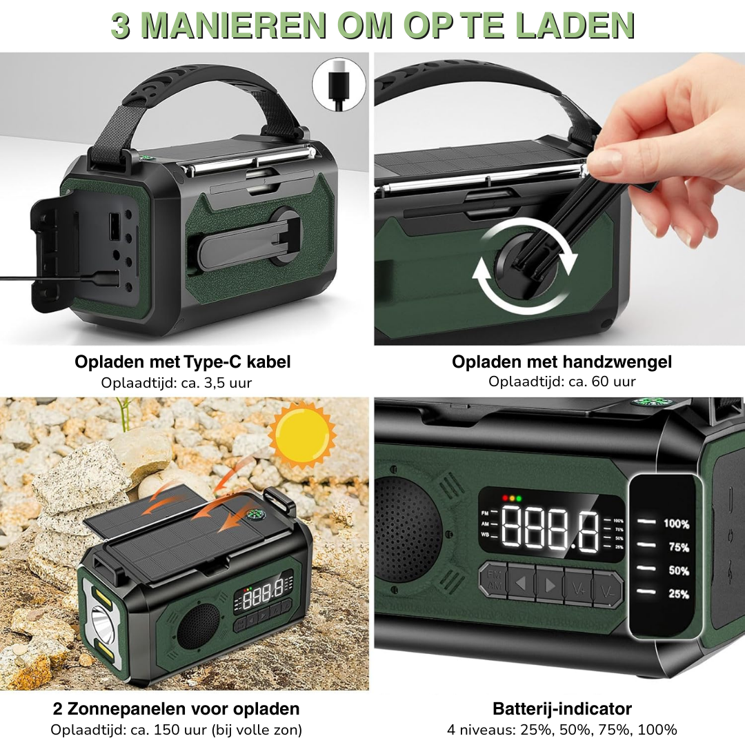 Wees altijd voorbereid met deze krachtige noodradio met een enorme capaciteit van 12.000 mAh en twee zonnepanelen. Of je nu thuis bent tijdens een stroomstoring of op avontuur in de natuur – dit compacte toestel combineert een radio, zaklamp, powerbank en nog veel meer in één.